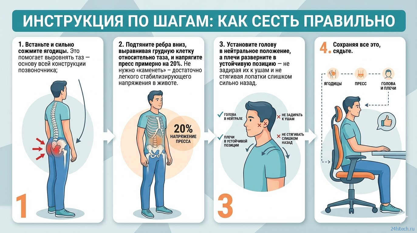 Авторы сайта 9to5mac предлагают простую последовательность из четырех шагов, которая помогает выстроить нейтральное положение позвоночника с активной поддержкой мышц корпуса. Техника начинается из положения стоя, и в этом весь смысл: сначала вы собираете правильную позу, а потом садитесь, сохраняя ее.