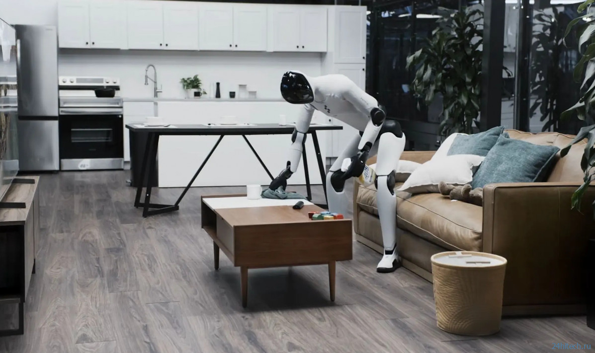 В семиминутном видео Figure 03 выполняет целую последовательность бытовых операций без какого-либо участия человека. Он берет губку и вытирает пролитую на стол жидкость, временно убирает тряпку под руку, чтобы освободить кисти, собирает разбросанные по дивану и столику предметы в коробку, перекладывает подушку, находит пульт ДУ и выключает телевизор. При этом машина постоянно манипулирует объектами двумя руками, перекладывает вещи, поворачивает пульт в ладони, чтобы нажать нужную кнопку, и даже протискивается боком между мебелью, используя точно отмеренные шаги.