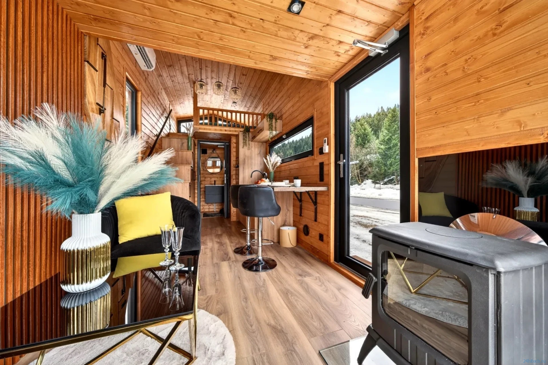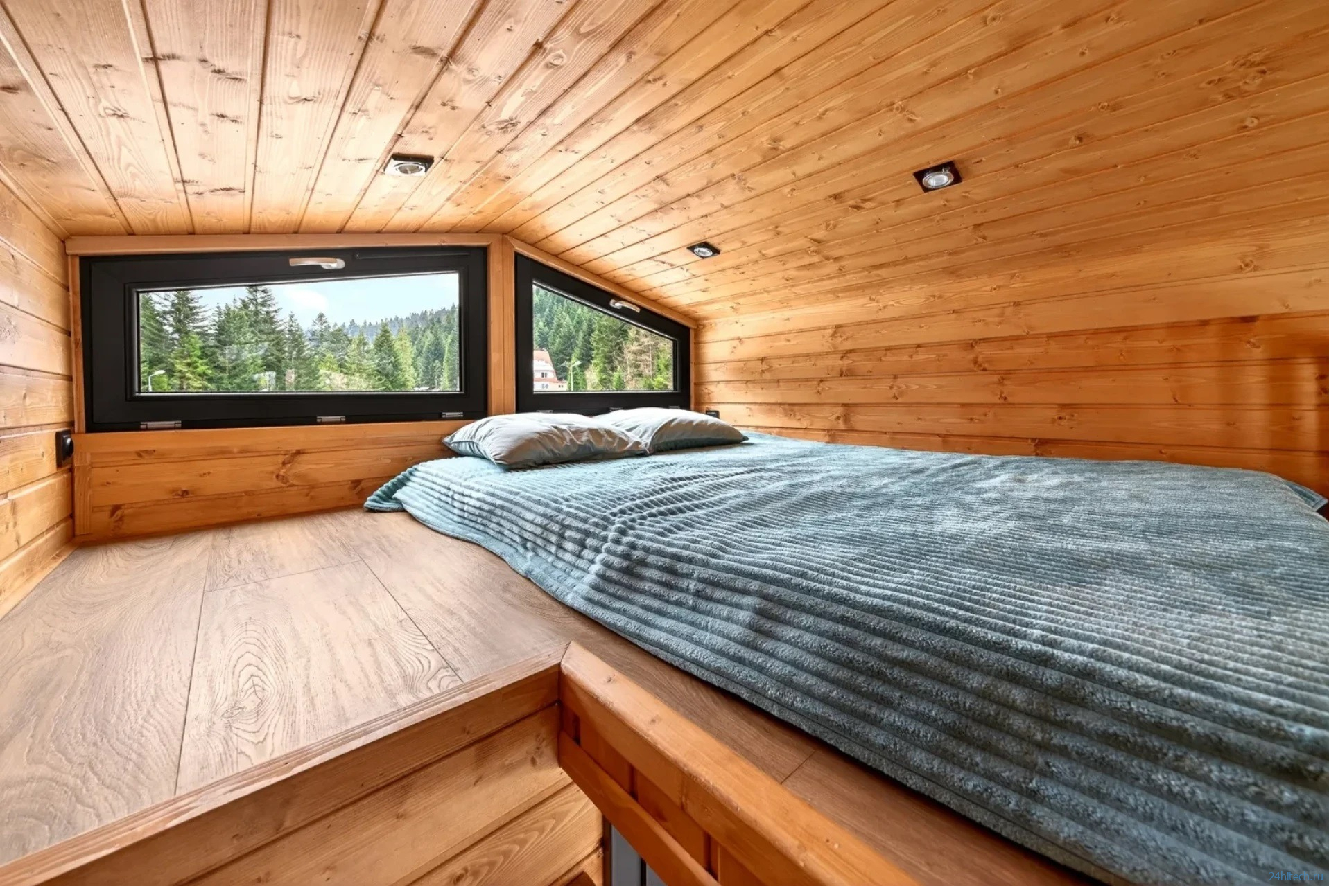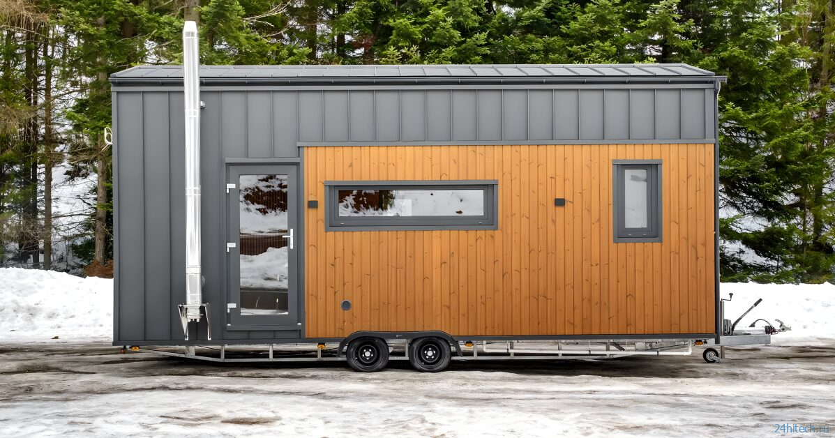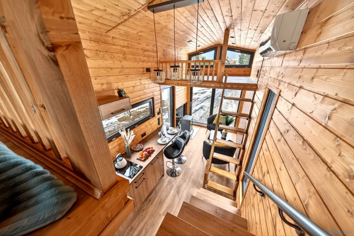 Внутренняя площадь составляет 18 м², а интерьер обшит скандинавской елью — она создаёт ощущение, напоминающее бревенчатый домик. Для такого крохотного пространства это работает отлично: натуральное дерево визуально «согревает» и расширяет интерьер. Главная идея этого дома — гибкость. Это не просто прицеп-дача для летних выездов, а полноценное жильё для круглогодичного использования с возможностью апгрейда до полной автономности.
