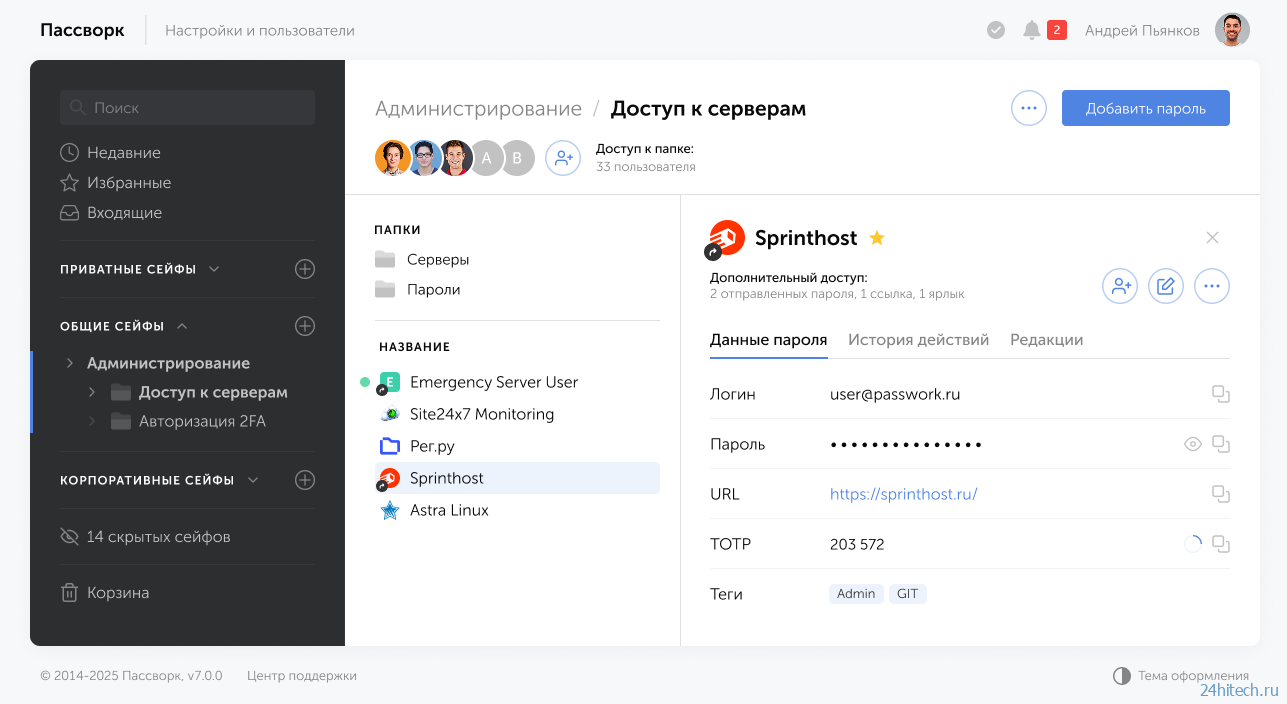 Пассворк всё это собирает воедино. Все пароли, ключи, сертификаты, секреты лежат в централизованном хранилище. Причем не просто лежат, а лежат в зашифрованном виде с контролем доступа и обязательно с аудитом. Кто и когда получал доступ к паролю — видно сразу. То есть не будет такого, что уволенный сотрудник потом еще полгода сможет заходить в корпоративные сети и пользоваться вашими сервисами.
