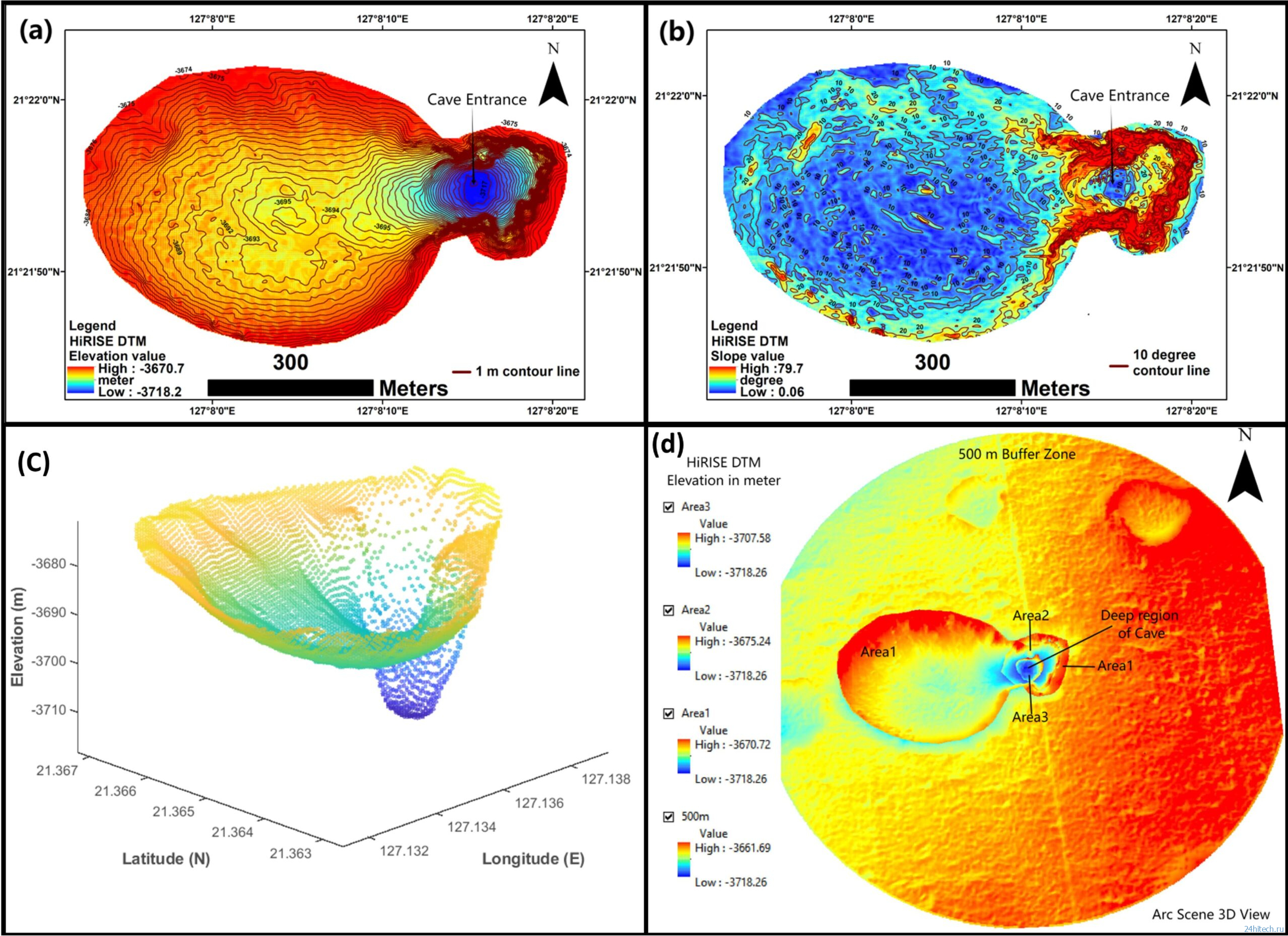 Геоморфологический анализ первой пещеры с помощью HiRISE подтверждает карстовое происхождение провала. (a) Карта высот показывает замкнутую асимметричную впадину, ограниченную крутыми уступами. (b) Карта уклонов показывает локальные крутые уклоны вдоль стенок впадины. (c) Трёхмерная модель иллюстрирует вертикальность впадины и асимметрию её объёма. (d) Показаны различия в величине оседания. Источник изображения: iopscience.iop.org