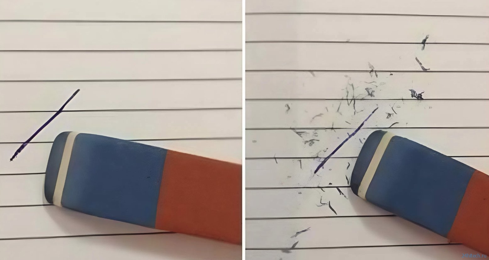 А вот пытаться стереть ручку синей стороной — плохая идея. Чернила не лежат на поверхности, как графит, а впитываются внутрь бумаги. Когда вы трете лист жесткой резинкой, стирается уже не надпись, а сама бумага. Отсюда и знакомые всем дырки в тетрадях.