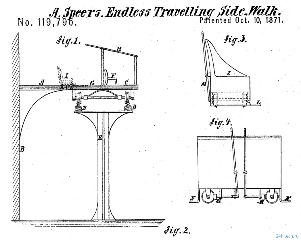 На патенте Альфреда Спира 1871 года на «Бесконечный движущийся тротуар» изображены удобные кресла, которые должны были двигаться по тротуару.