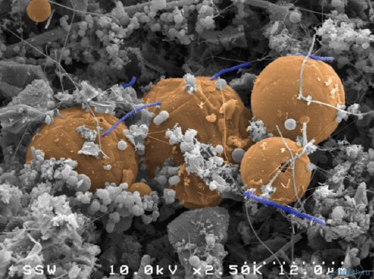 Candidatus Desulforudis audaxviator (фиолетовые палочковидные клетки между оранжевыми углеродными сферами) — это вид бактерий, которые выживают за счёт водорода, обнаруженные на глубине 2,8 км в шахте Южной Африки. Источник изображения: phys.org
