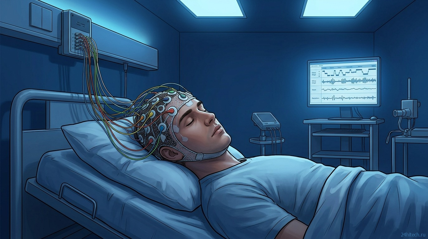 Участник исследования спит в лаборатории с датчиками ЭЭГ.
