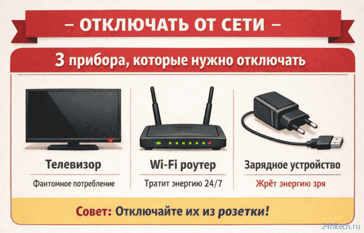 Чтобы начать бороться с нерациональным использованием электроэнергии, нужно отключать от сети эти три прибора, когда вы ими не пользуетесь.