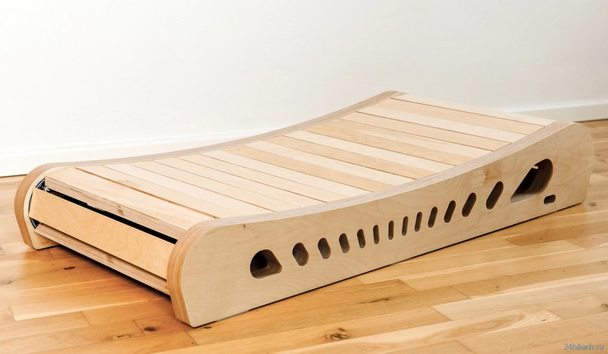 Ключевым преимуществом решения является его интуитивная простота – устройство естественно адаптируется к индивидуальному ритму движения и останавливается при необходимости концентрации или выполнения точных операций с компьютерной мышью. Прототип устройства был выполнен из цельного дерева, но тестовые испытания выявили чрезмерную жесткость поверхности. В серийной версии применены более упругие планки, обеспечивающие комфорт при длительном использовании и повышенную износостойкость.