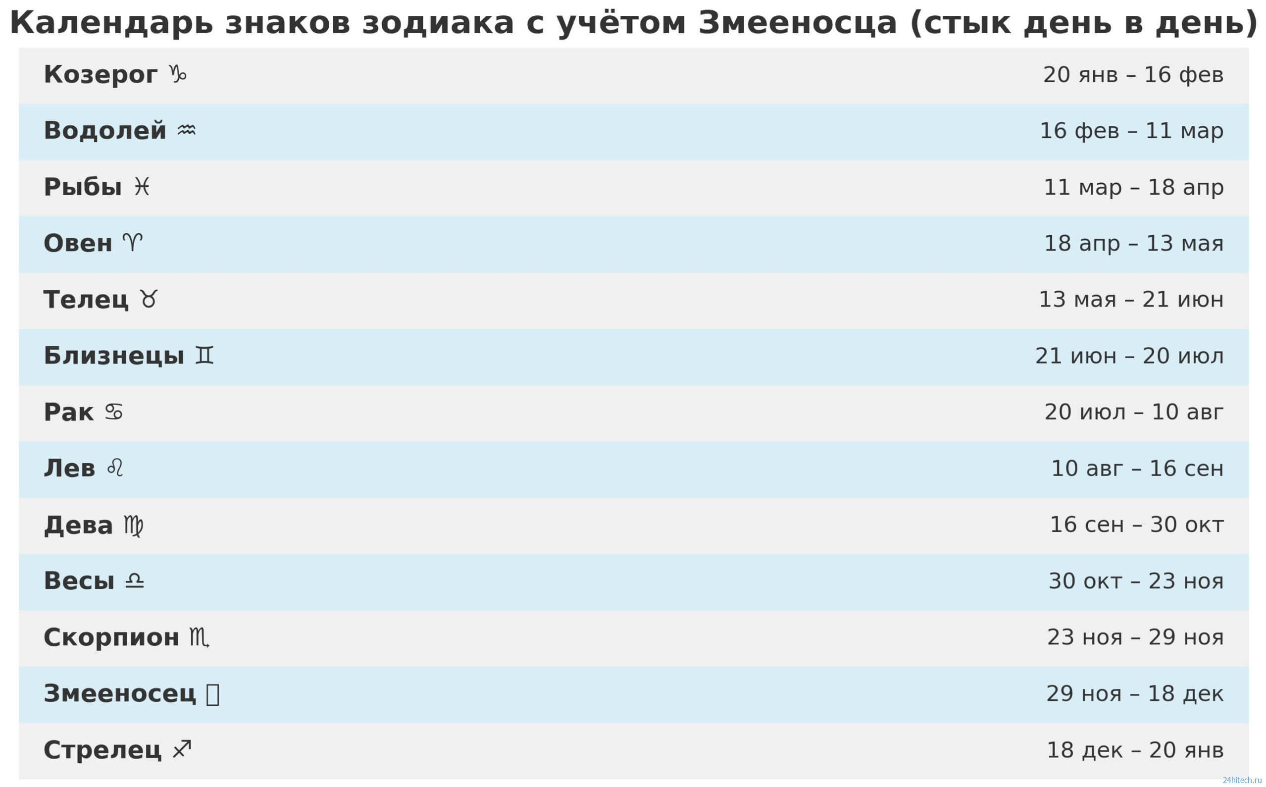 Если добавить змееносца, привычный календарь зодиака сильно меняется. Даты сдвигаются, потому что астрономы ориентируются на то, когда Солнце реально проходит через созвездия. Получается вот так.