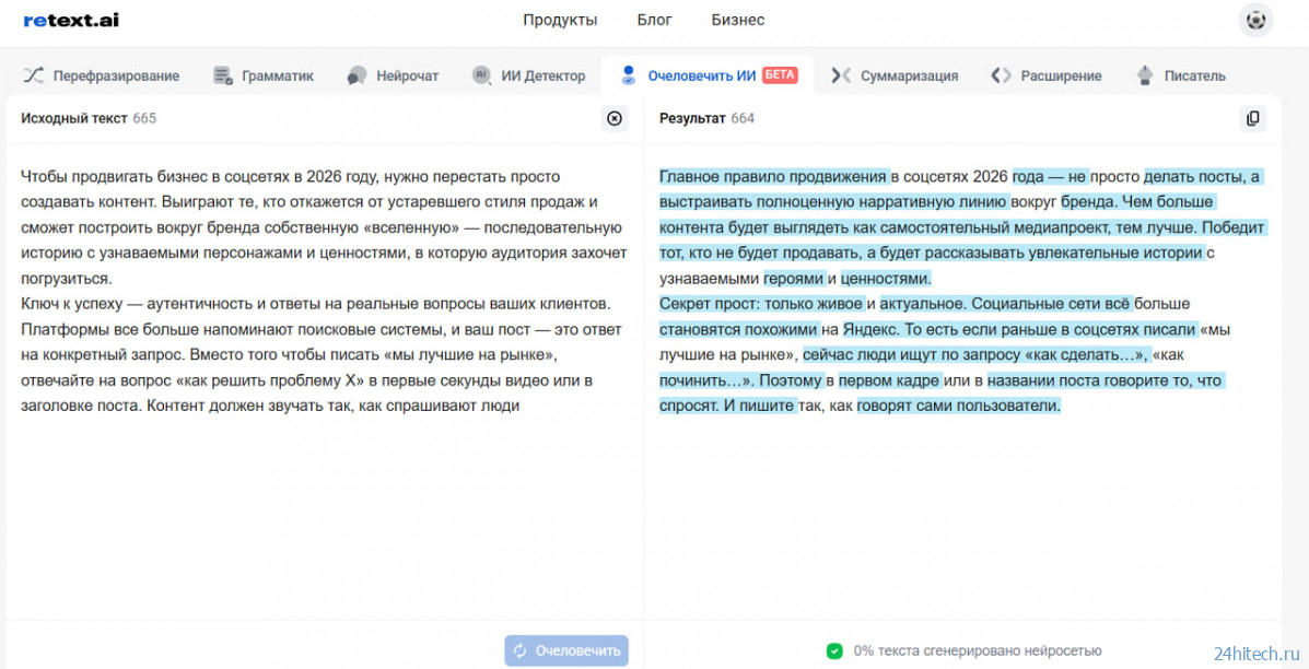 ReText.AI предложил решение — функцию «очеловечивание текста». Новый инструмент анализирует материал, находит характерные ИИ-паттерны (излишнюю «правильность», повторяющиеся обороты) и перерабатывает его, добавляя живые интонации и вариативность. Смысл остается тем же, но текст начинает звучать так, как будто его написал опытный журналист или писатель. Это стало ответом на запрос бизнеса, которому нужны инструменты для финальной «шлифовки» контента, чтобы сохранить доверие аудитории.