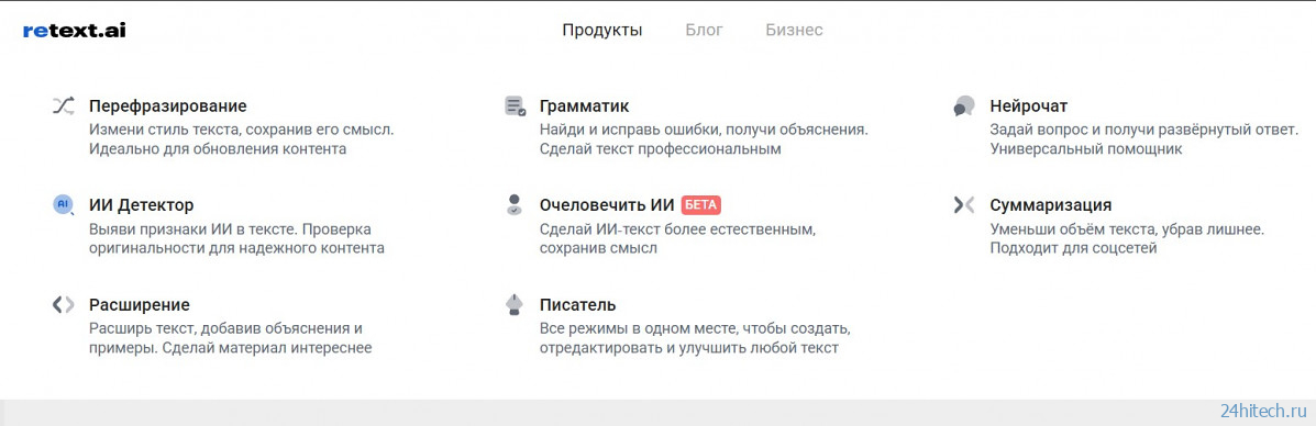 В отличие от универсальных нейросетей, ReText.AI изначально создавался как узкоспециализированный инструмент для копирайтеров, редакторов, студентов и SEO-специалистов. Его ключевая задача — не просто сгенерировать текст, а качественно его обработать: перефразировать, сохраняя смысл, расширить или, наоборот, сжать до нужного объема (суммаризация), избавить от шаблонных фраз и сделать уникальным.