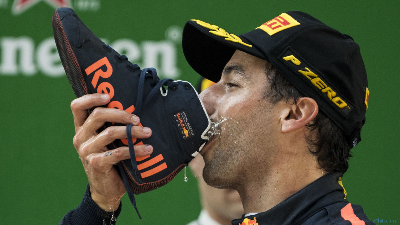 Даниэль Риккардо, пьющий шампанское из ботинка. Источник изображения: thescore.com