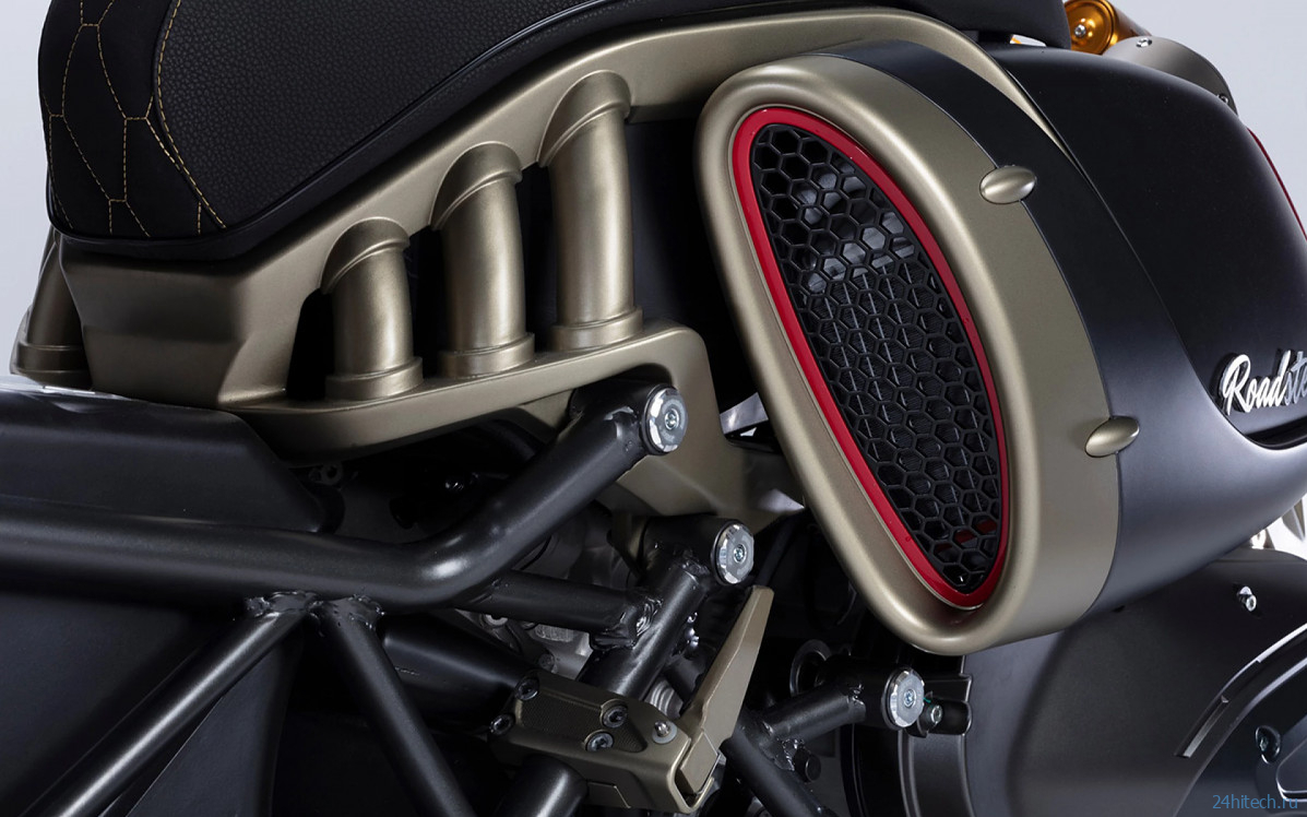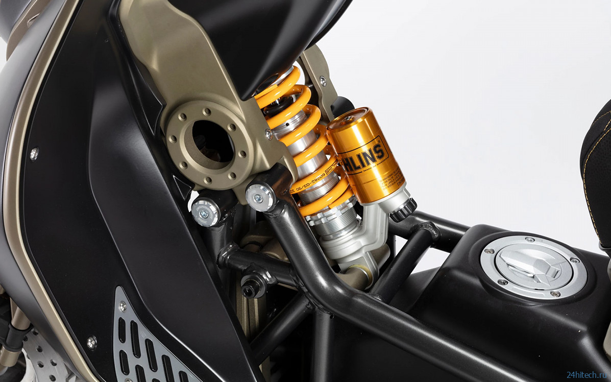 Дизайнерское решение включает стилизованные воздухозаборники, напоминающие авиационные турбины, которые выполняют практическую функцию охлаждения сдвоенных радиаторов. Заднюю часть украшают двойные выхлопные трубы от известного производителя Akrapovic, гармонично сочетающиеся с изящными задними фонарями. Подвеска представлена высококлассными компонентами от шведского бренда Ohlins, включая одиночный амортизатор, установленный между компонентами выхлопной системы.