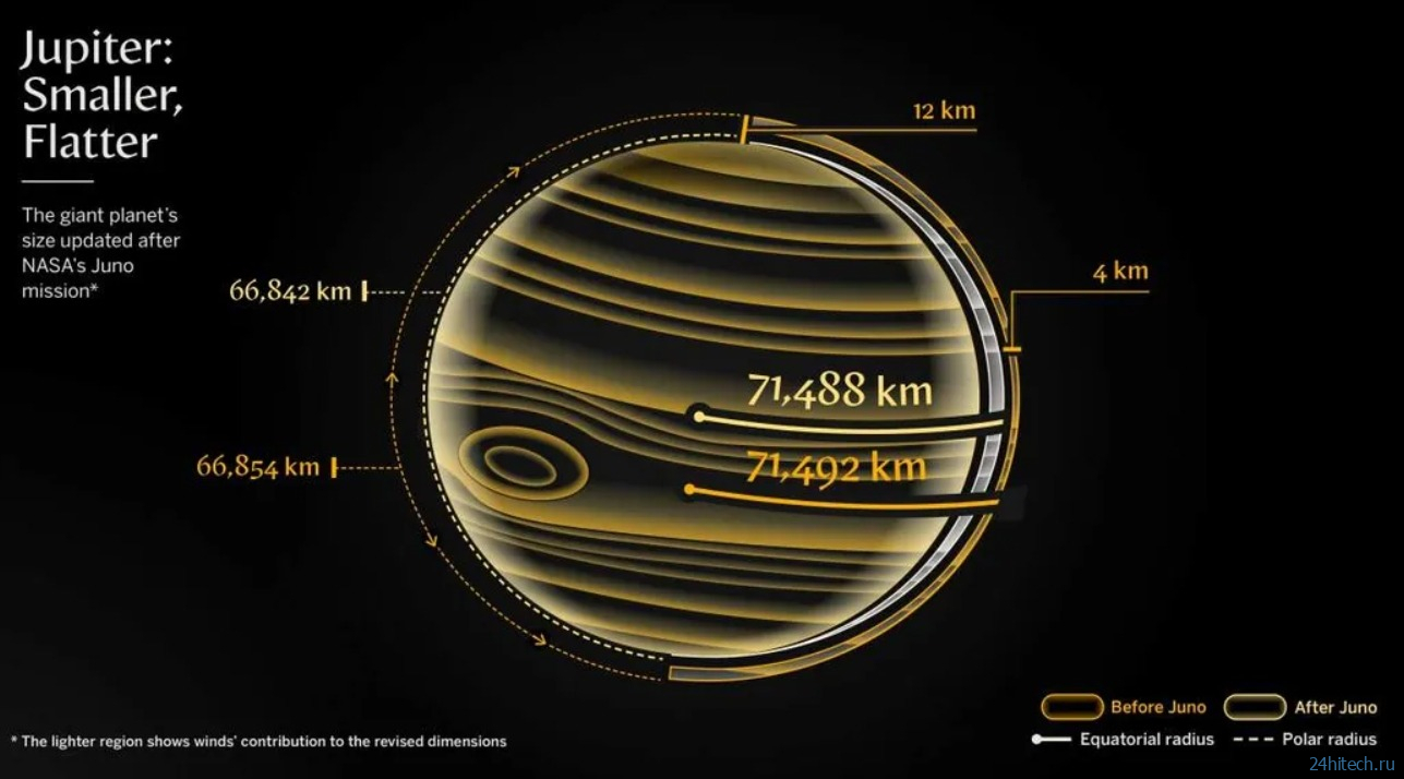 Новый анализ показал конкретные цифры: полярный диаметр Юпитера составляет около 133 700 км, а экваториальный — около 143 000 км. Это примерно на 24 и 8 км меньше предыдущих оценок соответственно.