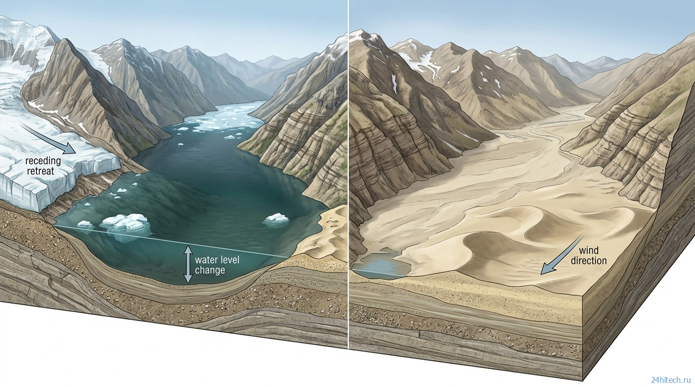 Схема формирования дюн: ледниковое озеро отступает, обнажая песчаные отложения