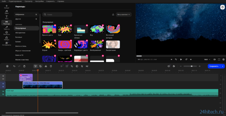 Универсальное решение, подходящее как новичкам, так и пользователям с опытом. Программа предлагает широкий набор инструментов: цветокоррекция, работа со звуком, библиотека готовых музыкальных треков, эффекты и титры.