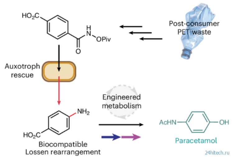 Ключевой этап здесь — биосовместимая перестройка Лоссена внутри E. coli, которая переводит ПЭТ-производные в аминные промежуточные соединения на пути к парацетамолу.